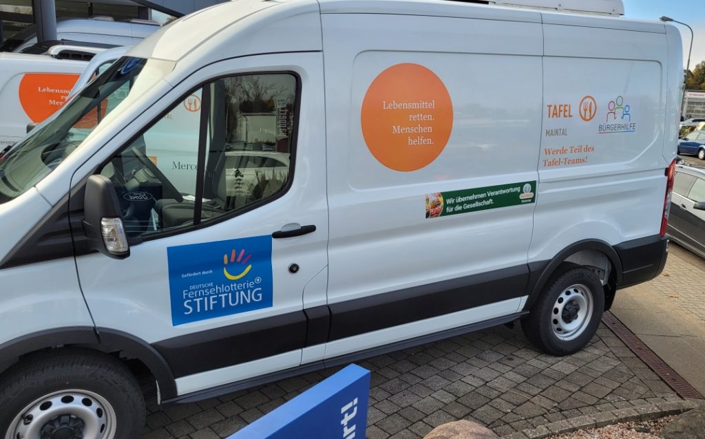 Von dieser Förderung profitierte nun auch die Tafel Maintal: Bereits vor einem Jahr stellte sie bei der Fernsehlotterie einen Antrag, da dringend ein neuer Transporter benötigt wurde. Der Antrag wurde umgehend genehmigt. Nun war es endlich soweit: Ende Oktober nahm Karl-Heinz Lutz, der gemeinsam mit seiner Ehefrau Heike die Tafel Maintal leitet, den nagelneuen Ford Transit in Empfang. Das neue Fahrzeug ist mit einer Kühlanlage ausgestattet, die die Lebensmittel – unabhängig von den Außentemperaturen – beim Transport fachgerecht kühlt und frisch hält. Zudem sorgt eine spezielle Ladevorrichtung dafür, dass auch Palettenware problemlos auf- und abgeladen werden kann.