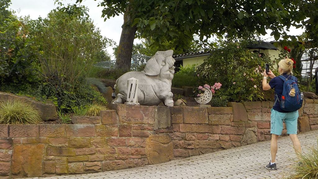 Anstrengend sollte es werden. Gleich zu Beginn führte ein schmaler Pfad hinauf in den alten Steinbruch „Königswald“, in dem ein Erlebnispark für Jugendliche eingerichtet ist. Dem „Erlebnis Rutsche“ konnten dann doch Einige nicht widerstehen. Welch eine Gaudi! Auf dem von hohen Felswänden aus rotem Sandstein umsäumten „Gruselpfad“ durchwanderte die Gruppe das weitläufige Gelände. Nach verlassen des Steinbruches führte der Wanderweg in das ausgedehnte Waldgebiet des Königswald. Vom Waldrand aus gab es einen ersten weiten Blick auf Obernburg und das benachbarte Elsenfeld. Über den „Mittleren Höhenweg“, hoch über den Dächern der Obernburger Altstadt, eröffnete sich nochmals ein weiter Blick über die Stadt und das Maintal bis in den Spessart hinein. Über eine lange Treppe, im Volksmund auch „Himmelsleiter“ genannt, ging es hinunter in die Stadt. Im „Das Wirtshaus“ gab es leckere Biere und bayrische Schmankerl.