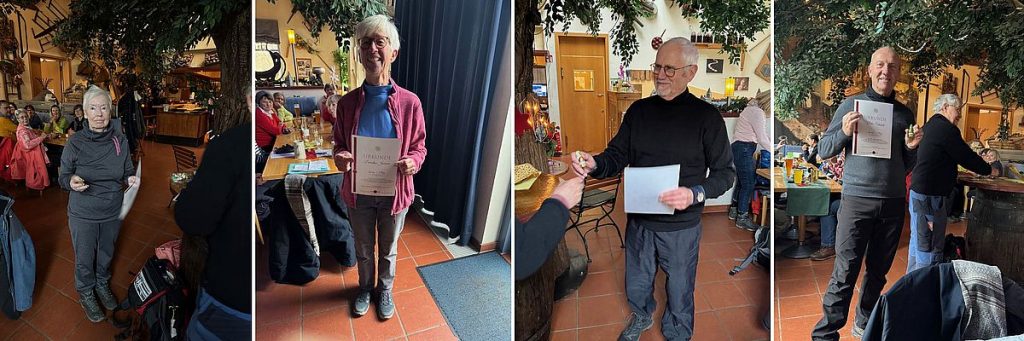 Nach einem Zwischenstopp in der Nähe der Sportanlagen von Nieder-Erlenbach verlief der Weg am Rande des „Großen Rieds“ nach Ober-Erlenbach. Hier öffnete das Restaurant „Alte Kelterei“ exklusiv seine Türen für die Gruppe und lud zu einer wohlverdienten Mittagsrast ein. Beste Gelegenheit um die erfolgreichen Wander-Champions der Wandersaison 2023/24 zu ehren. Nach leckerem Essen und anregenden Gesprächen hatten die Wanderinnen und Wanderer neue Energie für den zweiten Teil der Wanderung.