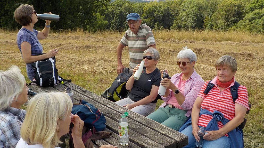 Frisch gestärkt führte der Weg über den Schützenhofsteg auf die andere Niddaseite. Vorbei am Römer-Mosaik und zwei Mineralquellen ging es weiter in Richtung Wasserburg. Nach dem Überqueren des Mühlenstegs begann der sportlichere Teil der Wanderung: ein längerer Anstieg, der seinem Namen als Teil des „Vilbelsteigs“ gerecht wurde. Die Strecke führte durch offene Streuobstwiesen und anschließend zurück in den Wald. Nach einem letzten Überqueren der B521 kehrte die Gruppe wieder zum Ausgangspunkt in Bergen-Enkheim zurück – zufrieden und mit vielen schönen Eindrücken im Gepäck.