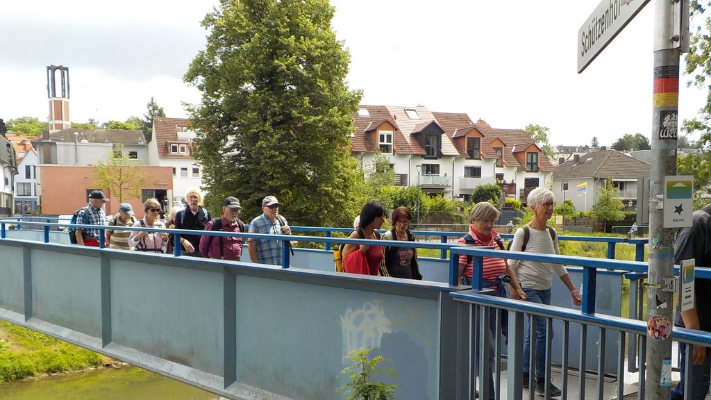 Nach der Überquerung der vielbefahrenen B521 führte der Weg zunächst durch weitläufige Felder in Richtung Bad Vilbeler Wald. Dort ging es auf angenehmen, gut begehbaren Pfaden am Waldrand entlang – eine ruhige, grüne Strecke, die den Einstieg in die Wanderung besonders angenehm machte. Bald begann der Abstieg in Richtung Bad Vilbel. Der Abschnitt entlang des Ortsteils Heilsberg war stellenweise etwas steiler, ließ sich aber gut bewältigen. Über den Südbahnhof erreichte die Gruppe schließlich das Stadtzentrum von Bad Vilbel. Die Stadt war in diesem Jahr Gastgeber des Hessentags. Entlang der Nidda ging es weiter – vorbei an der modernen Stadtbibliothek – in die Frankfurter Straße. Dort wartete das Restaurant „Zur Krone“ auf die Wandergruppe, die sich bei einem gemeinsamen Mittagessen stärken konnte.
