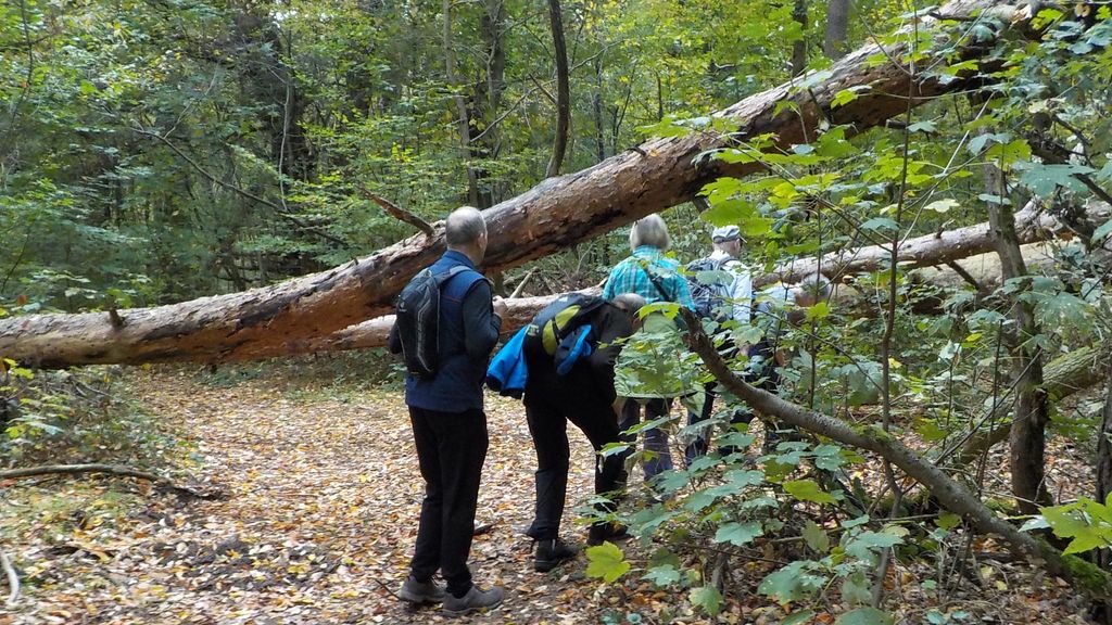 Bis 1982 wurde hier Basalt abgebaut; heute präsentiert sich das Gebiet als eindrucksvolle Seenlandschaft, die zum Verweilen und Staunen einlädt. Beim Überwinden umgestürzter Bäume bewiesen die Wanderinnen und Wanderer sportlichen Einsatz, und auf den verschlungenen Pfaden kam stellenweise echtes Urwald-Feeling auf.